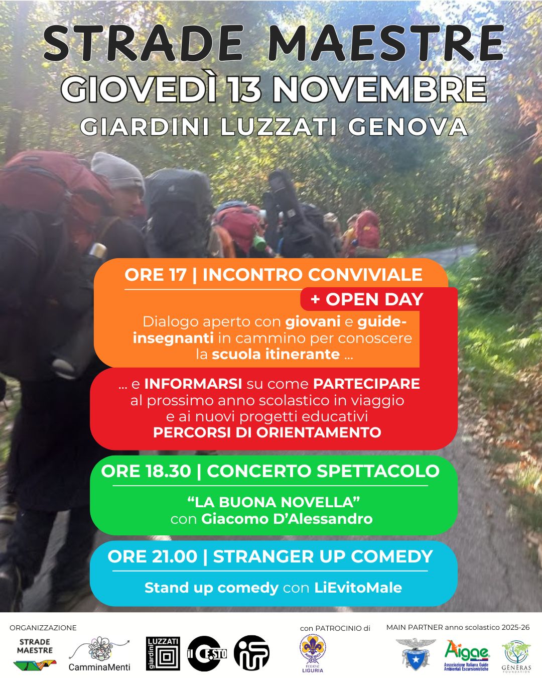 Giovedì 13 novembre, ai Giardini Luzzati di Genova, Strade Maestre invita giovani, insegnanti e curiosi a un pomeriggio di incontro e condivisione dedicato alla scuola itinerante e ai nuovi percorsi educativi in cammino.